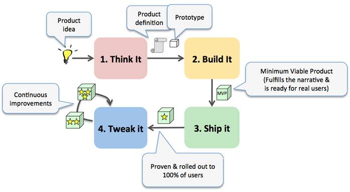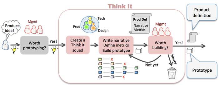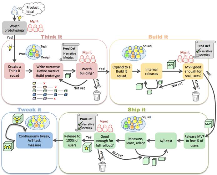 All major product initiatives go through four stages Think It”, Build It”, Ship It”, and Tweak It”. Heres a picture illustrating the flow from idea to product, and what comes out of each stage along the way. You’ll find a more detailed version of this picture at the end of the article.