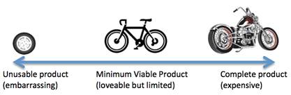So the squad needs to figure out the smallest possible thing they can build to fulfill the basic narrative and delight the users. We need it to be narrative-complete, not feature-complete. Perhaps a better term is Minimum Loveable Product. A bicycle is a loveable and useful product for somebody with no better means of transport, but is still very far from the motorcycle that it will evolve into.  We do need to fulfill the basic narrative though, or our measurements will be misleading: Hey, we released a wheel, and nobody used it, so the product is a failure and we shouldnt build the rest of the bike!