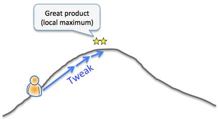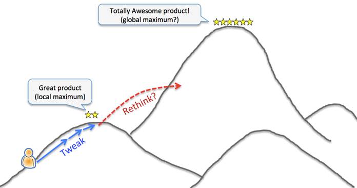 At this point the squad and management will discuss: are we happy being at the top of this hill, or is there a higher peak to be found? In the former case, the squad may gradually move on to other products. In the latter case, the squad may go back to Think It to reimagine this product and make a leap for the global maximum (or at least a higher peak).